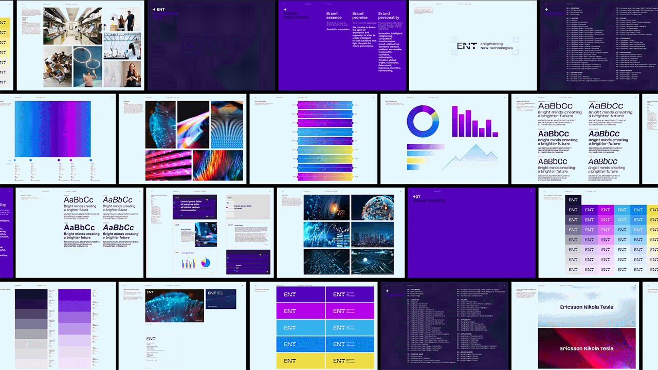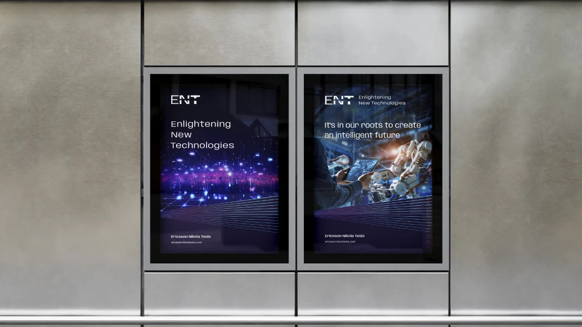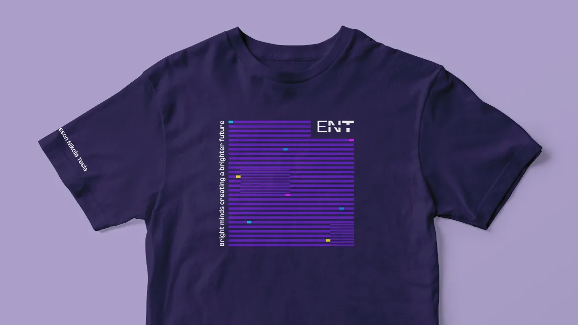 Logotip prikazuje slova ENT i zrake svjetlosti koje kroz njih prolaze. Tipografija je suvremena i snažna, upućuje na kompaniju koja stvara inovativna rješenja. Osvježeni i dinamični vizualni identitet postignut je i odabirom vibrantnih boja. Novi, moderniji vizuali sugeriraju stvaranje inteligentne budućnosti. Kreirali smo inspirativni brand video koji kroz asocijacije prikazuje važnost ENT rješenja na cjelokupno društvo i pojedinca te sound logo koji dočarava tehnološki imidž kompanije.
