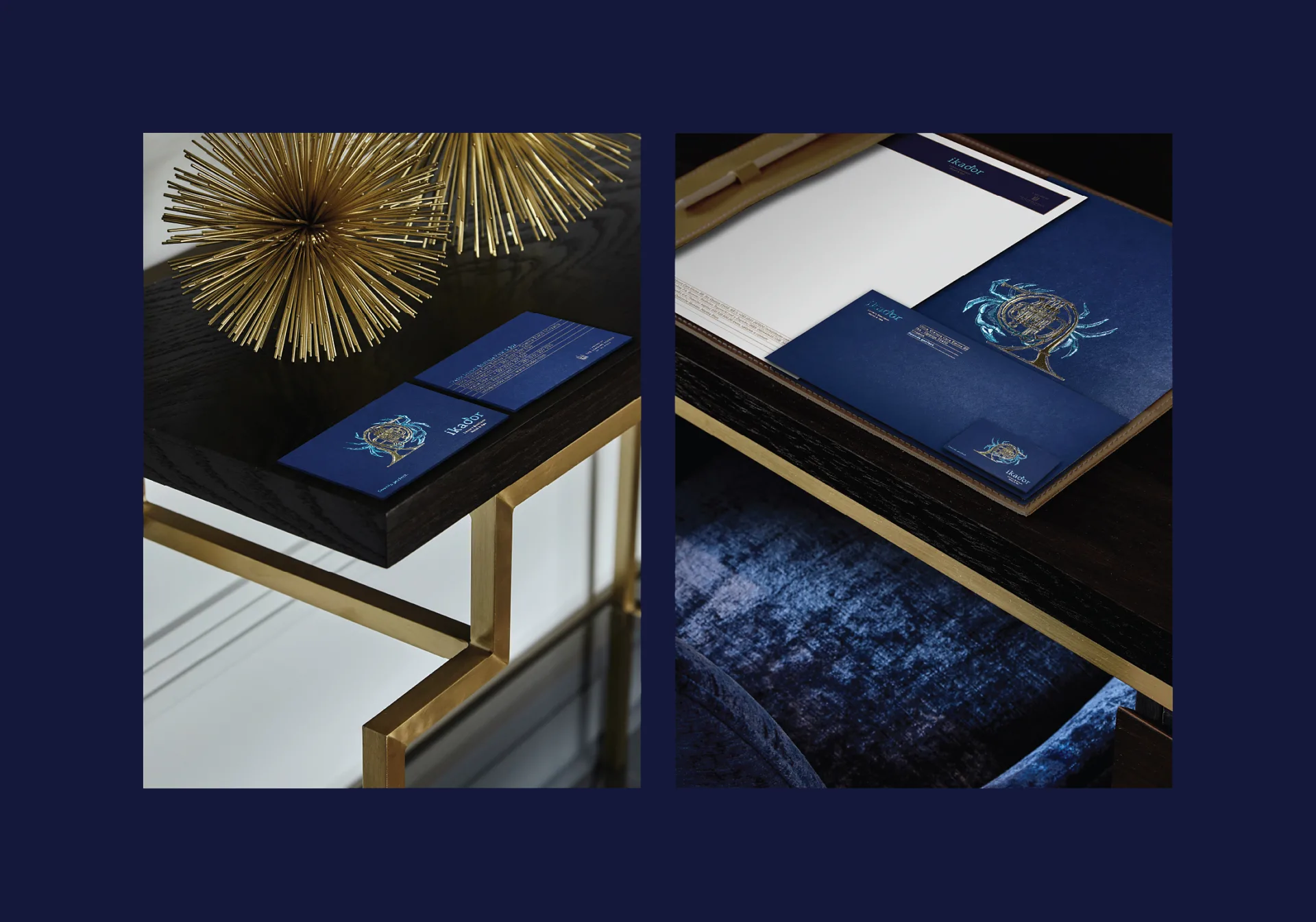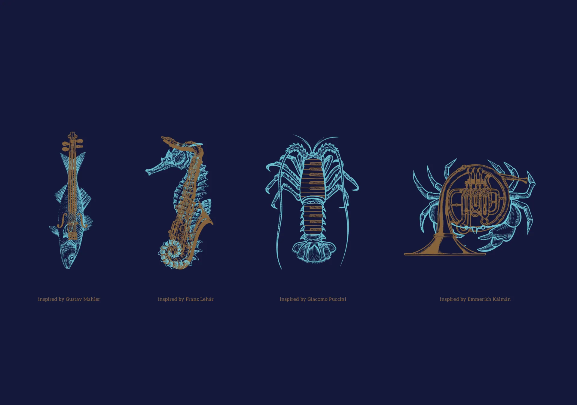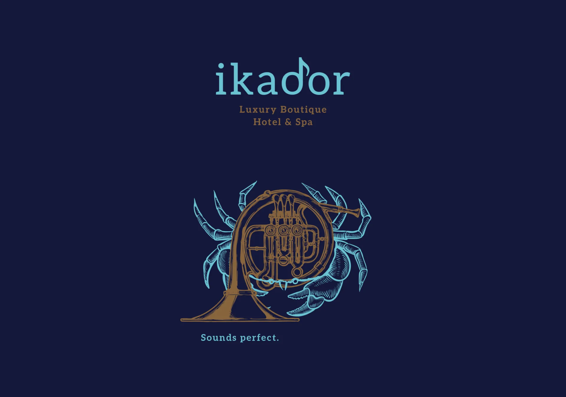 The visual identity was inspired by the very meaning of the word Ikador. The minimalist design of the logo is enhanced by the letter “d”, which has been converted into a musical note. The illustrations dominating the visual identity are inspired by composers, as well as a sea motif due to the hotel being located on the sea. The artist created impressive illustrations highlighting an unusual combination of both motifs: fish-violin, sea-horse-saxophone, lobster-piano and horn-rays. Just as composers often use everyday objects as musical instruments, producing interesting sounds and tones, the intention of the brand logo was to achieve a harmonious combination of these unusual motifs, the sea and music. Blue and gold are used in the visual identity. Blue is associated with the color of the Kvarner Sea, while the gold is associated with the color of musical instruments, while further stimulating the feeling of elegance and luxury.