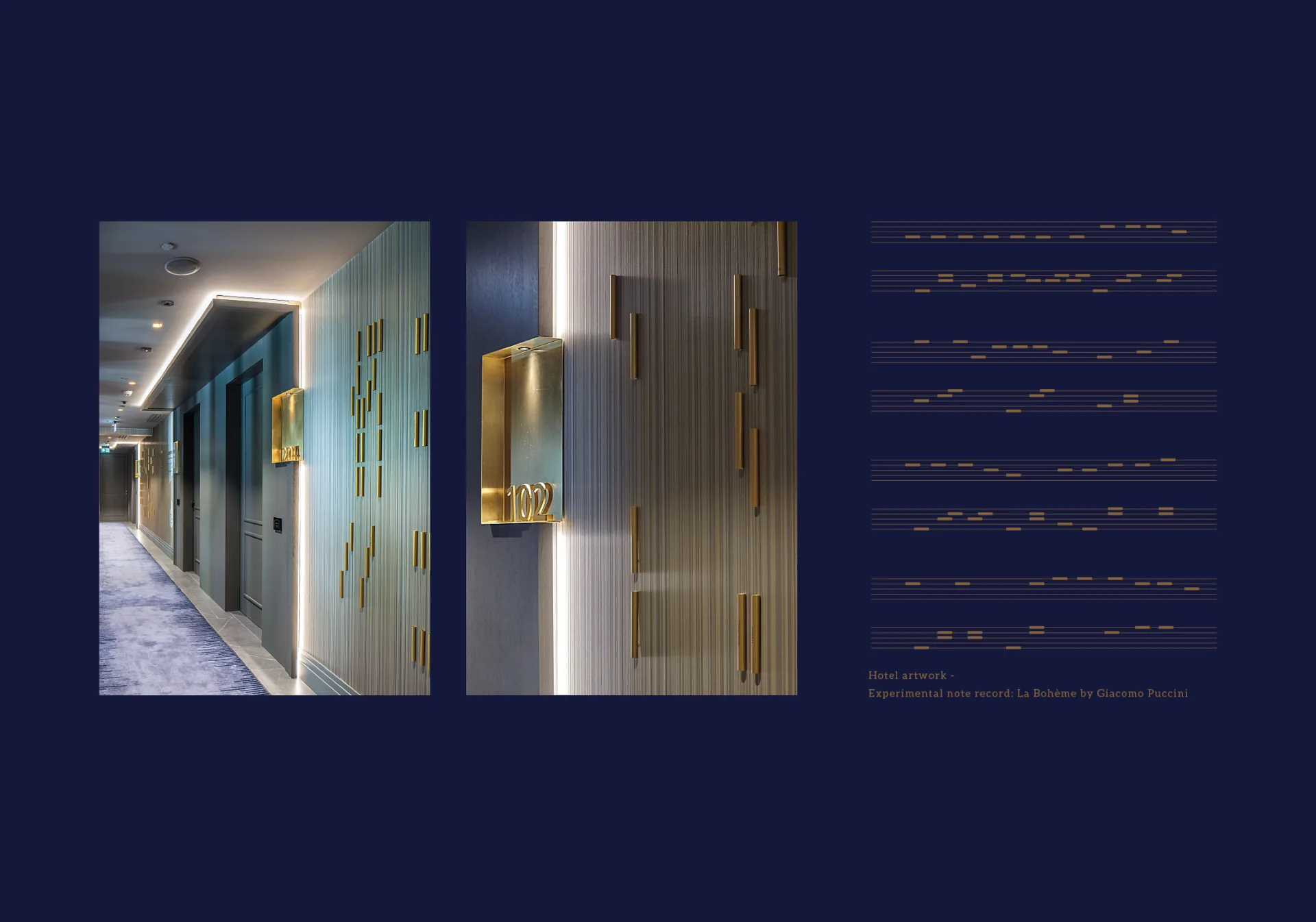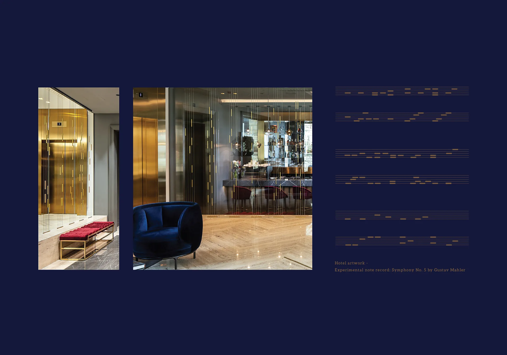 In addition to the visual identity and the signage concept, a series of spatial installations have been installed throughout the interior of the hotel. These installations were inspired by experimental notes of music and compositions by Mahler, Lehár, Puccini and Kálmán. The composition of each installation comes from traditional notation and sheet music. The engraved text of the brand story adds to the visitor’s imagination and invites her to explore the sounds of each installation. Light rhythmic elements, musical notation shaped from gold tubes attached to thin wires recalls the musical notes in a piece of music. These installations accompany visitors throughout the hotel and further emphasize its musical theme. These installations generate a more powerful experience for the guests by visually expressing the brand’s musical motif.