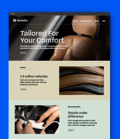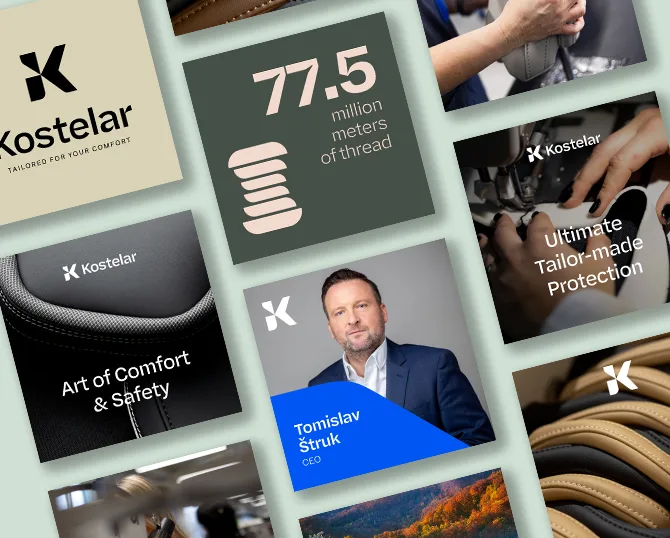 Kostelar manufactures armrests and headrests for over a million vehicles per year. Their biggest strenght lies in skillful and diligent hands of more than 500 sewists, that produce seating systems unmatched in precision and stitch perfection. That was the backbone of our new brand story.